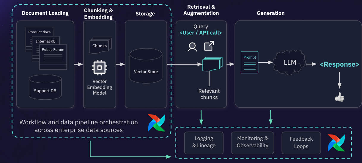 For Generative AI, Airflow can automate tasks such as creating vector embeddings for RAG applications, model retraining and deploying updated models in production, ensuring that systems stay current with new data. This results in smoother MLOps pipelines, enabling faster iteration and model scalability.
